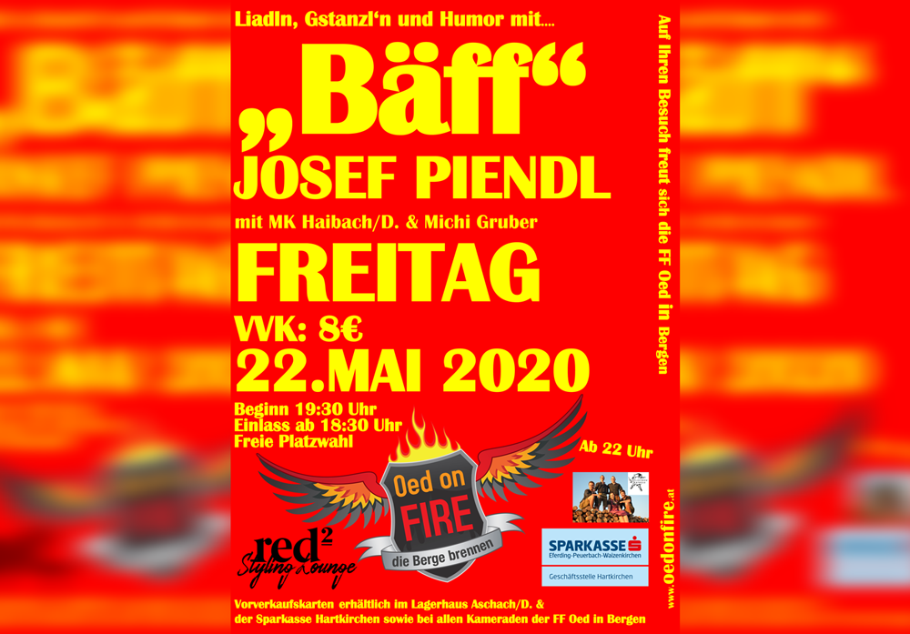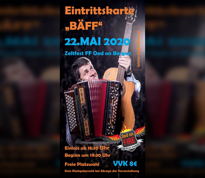 Vorverkaufskarten für Freitag zum Preis von 8 Euro gibt`s bei allen Kameraden der FF Oed in Bergen, im Lagerhaus Aschach sowie in der Sparkasse Hartkirchen. Einlass ab 19 Uhr bei freier Platzwahl.